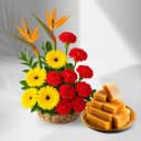 This gift combo includes: - Mixed Flowers Arrangement (3 Gerberas,4 Carnations and 3 Birds of Paradise) - Milk Cake (500 Gms) This delightful gift combo features a stunning mixed flowers arrangement that includes 3 vibrant gerberas, 4 charming carnations, and 3 exotic birds of paradise, creating a colorful and cheerful centerpiece for any occasion. The lively hues and diverse textures symbolize joy and celebration, making this arrangement a perfect gift for birthdays, anniversaries, or just to brighten someone’s day. Accompanying this beautiful bouquet is 500 gms of soft and luscious milk cake, a traditional Indian sweet known for its rich flavor and moist texture. Together, the refreshing blooms and the indulgent treat create a thoughtful gift that captures the essence of joy and sweetness, ensuring a memorable experience for the recipient.