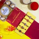 Product Details: - Five Kundan N Evil Eye Rakhi Set - Type: Designer Rakhi - Material: Metal - Colour: Multicolor - Reciepient: Brothers - Design Code: - 16 pcs Ferrero Rocher Chocolate 200g - Complimentary Roli Tika N Chawal - A Free Message Card is also Included (Rakhi Design Code: EVD7508,SAJ2907,SAJ2713,SAJ2914,SAJ2719) Introducing our exquisite Charming Rakhi and Chocolate Combo, the perfect combination of love, tradition, and indulgence. This stunning set includes five beautifully designed Kundan Evil Eye Rakhis, along with a delightful box of 8 Ferrero Rocher chocolates, complimentary Roli Tika N Chawal, and a free message card. Celebrate the joyous festival of Raksha Bandhan in style with this thoughtfully curated gift. Each rakhi in this set is carefully handcrafted with intricate Kundan work, adding a touch of elegance to this traditional thread. The metal material used ensures durability and longevity, symbolizing the everlasting bond you share with your dear brothers. The vibrant multicolor design adds a charming appeal and represents the festive spirit of Raksha Bandhan. In addition to the stunning rakhi set, we have included a box of 8 Ferrero Rocher chocolates, as a token of love and sweetness. Indulge in the heavenly combination of rich, creamy milk chocolate and a crunchy hazelnut center, delivered in perfectly golden wrappers. These delectable chocolates are sure to delight the taste buds of your brothers and make the celebrations even more memorable. To complete the ritual, we have also included complimentary Roli Tika N Chawal, adding a traditional touch to the festivities. The bright red Roli represents the unconditional love and protection a sister bestows upon her brother, while the sacred Chawal signifies prosperity and good luck. With these essentials, you can perform the traditional Rakhi ceremony with ease and sincerity. Additionally, the free message card allows you to convey your heartfelt emotions to your brothers. Write a personal message, share memories, or express your gratitude for their love and support. This thoughtful addition adds a personalized touch to this already perfect gift. Whether you celebrate Raksha Bandhan in person or from a distance, our Charming Rakhi and Chocolate Combo is designed to make this festival truly memorable. Delight your brothers with this luxurious gift set and let them know how much they mean to you. Order now and make this Raksha Bandhan an occasion to cherish forever. (Rakhi Design Code : SAJ2713,SAJ2719,SAJ2904,SAJ2907,SAJ2914)