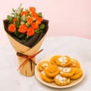 This gift combo includes: - 15 Orange Roses Tissue Wrappd Bouquet - Chandrakala (10 Pcs) Surprise someone special with our exquisite gift combo: the Orange Rose N Chandrakala Bliss! This striking arrangement features 15 luxurious orange roses, carefully wrapped to enhance their natural allure. Symbolizing passion and joy, these roses create a cheerful ambiance for any celebration or thoughtful gesture. Adding to the charm, we include ten pieces of decadent Chandrakala, a beloved sweet treat known for its creamy center and light wrapping. Together, these elements create a delightful experience that celebrates connections and shared moments. Give a gift that expresses your heartfelt sentiments!