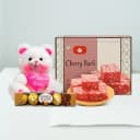 Experience a delightful fusion of flavors and affection with the Cherished Moments Treat. This carefully curated set features the exquisite Mohanlals Mithaiwala Cherry Barfi, a huggable teddy bear, and four indulgent Ferrero Rocher chocolates. Each bite of the cherry-infused barfi is a reminder of sweet memories, while the teddy bear brings warmth to your heart. Perfect for any celebration, this combo radiates joy and love. Available exclusively in Ahmedabad, it offers a sweet experience your loved ones will cherish forever.