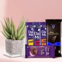 Indulge in a gift that combines nature's touch with deliciousness! The Chocolate-Laden Aloe Bliss package includes a thriving Aloe Vera plant nestled in an elegant glass pot, bringing a fresh accent to any indoor space. Accompanied by an exquisite selection of Cadbury chocolates, from the crunchy Roast Almond to the velvety Bournville, this offering is perfect for housewarmings, birthdays, or any occasion that calls for a little sweetness. Let this beautiful combination convey your heartfelt emotions to those you cherish.