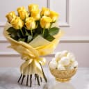 This gift combo has: - 10 Yellow Roses Bouquet - Rasgulla (1Kg) A sweet and fragrant indulgence! When a tin of Haldirams spongy, sweet Rasgulla (Weight : 1 kg) is coupled with a Classic Bouquet of 10 Yellow Roses, the temptation touches a whole new level. Just give it to them and they will crave more for it.