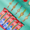 This is a gift of: - Set of 5 Kundan Rakhi by Rakhi Sutra (PRRK8260, PRRK8112A, KPRK0313, PRRK8234Y, PRRK8089Y) - 5 Pcs Kitkat Coated Wafer (18.5g) - Complimentary Roli Tika N Chawal - Complimentary Message Card with Free Rakhi Celebrate the bond of love and tradition with this exquisite gift set featuring a stunning collection of 5 Kundan Rakhis by Rakhi Sutra, including designs PRRK8260, PRRK8112A, KPRK0313, PRRK8234Y, and PRRK8089Y, each crafted to symbolize protection and affection. Alongside these beautiful Rakhis, enjoy a delightful treat of 5 pieces of Kitkat Coated Wafers (18.5g each), perfect for sharing sweet moments. The set is thoughtfully complemented with Roli Tika and Chawal to complete your Raksha Bandhan rituals, and a free personalized message card to convey your heartfelt wishes, making this gift a perfect blend of tradition, taste, and sentiment.