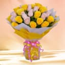Send surprises as a gift of Classy 25th Wedding Anniversary Celebration Floral Gift to the persons close to your hearts. This Anniversary special flowers bunch is elegantly arranged with 50 Yellow N Pink Roses with Tissue Wrapping.