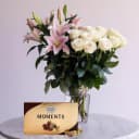 Bring your mother much closer to you with this Mothers Day gift of Classy Display of 8 Pink Lilies with 15 White Roses in Glass Vase with 16 pcs Ferrero Rocher Moments Chocolate Box and show that you love her the most.