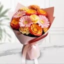 Immerse yourself in a lively tapestry of colors with the Colorful Bliss Floral Ensemble. This exquisite bouquet features six radiant orange roses symbolizing passion, three playful pink gerberas for a touch of cheer, and three sunny yellow carnations that embody friendship and joy. Expertly arranged by hand and elegantly wrapped in charming baby pink paper, this floral masterpiece is the perfect gift for any occasion. Whether to ignite a romance or simply to spread happiness, this bouquet conveys your heartfelt emotions beautifully.