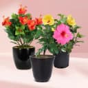 Transform any outdoor area into a floral paradise with this captivating set of three potted hibiscus plants. Each plant stands tall at 3 to 5 inches and comes in chic black containers, ready to enhance the beauty of gardens or balconies. Gift this delightful trio and watch loved ones beam with joy as these gorgeous blooms unfold, creating a vibrant atmosphere outdoors. Perfect for birthdays, anniversaries, or just because, this set invites everyone to experience the joys of nature.