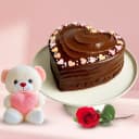 This gift combo has: - A Red Rose - Heart Shaped Chocolate Cake (1Lb) - A Small Teddy A classic gift, this fascinating Combo of Heart Shaped Chocolate Cake with small Teddy N Red Rose makes any celebration much grander.