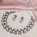 This is a gift of: - A Dual Tone Kundan Neckpiece - A Pair of Kundan Earrings Presenting a gorgeous blend of modern design and traditional craftsmanship, this dual-tone Kundan neckpiece and earrings set is a must-have. The neckpiece, adorned with dazzling dual-tone Kundan stones, is intricately crafted to add a sophisticated edge to your jewelry collection. The matching Kundan earrings seamlessly complement the neckpiece, making it perfect for special celebrations or daily elegance. For optimal maintenance, clean with spot-cleaning methods and store the set in its own box. Keep away from water and fragrances to ensure the preservation of their exquisite shine and detailed patterns.