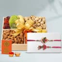 This rakhi gift combo contains : - One Set of Bhaiya Bhabhi Rakhi - One pack of Almond (200 g) - One pack of Pistachio (200 g) - One pack of Dates (200 g) - One pack of Dried Kiwi (200 g) - One pack of Dried Apricots (200 g) - One pack of Dried Amla Candy (200 g) - One Reusable Wooden tray - Complimentary Roli Tilak and Chawal - Complimentary Rakhi Card with personalized message. Celebrate the eternal bond of love and tradition with this thoughtfully curated Rakhi gift combo, perfect for your beloved Bhaiya and Bhabhi. This festive hamper features a beautiful set of Bhaiya Bhabhi Rakhi, symbolizing your heartfelt wishes and blessings. Complementing the rakhis are six packs of premium dry fruits, including 200g each of almonds, pistachios, dates, dried kiwi, dried apricots, and dried amla candy—each selected for their freshness and health benefits. These wholesome treats are elegantly arranged in a reusable wooden tray, making it both a delightful and practical gift. To complete the festive experience, the combo includes complimentary Roli Tilak and Chawal for the traditional rituals, along with a personalized Rakhi card to convey your heartfelt message. A perfect blend of tradition, taste, and thoughtful gifting.