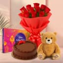 This gift combo has: - 10 Red Rose Bouquet - Chocolate Cake (1 Lb) - A Cute Teddy Gift someone close to your heart this Anniversary gift of Cute Teddy Surprise with Chocolate Cake (1 Lb), 10 Red Rose Bouquet N Cadbury Celebrations Pack (126 gms) and appreciate them of the special feelings that they have brought to your life.