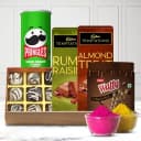 Surprise your loved ones by sending this Delectable Chocos Gift Basket for Holi and make them happy. This item comprises of: 1. 9 pcs Handmade Chocolate Box 2. 2 Cadbury Temptations Rum n Raisins 3. Dukes Chocolate Rolls 4. Pringle Chips 5. Free Organic / Herbal Gulal (2 pkts)
