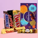 Surprise your sister with this delightful chocolate treat basket featuring an assortment of 4 Pcs. Ferrero Rocher, Cadbury Celebration, Snickers, Mars, Toblerone, and Twix. Perfect for any occasion, this festive gift can be sent anywhere in India to bring a smile to her face. (Please note: Design may vary.)