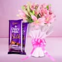 This gift combo has: - 6 Pink Lilies Bouquet - 2 Dairy Milk Silk (70 gms each) Send this Anniversary special Pleasurable 2 Dairy Milk Silk (70 gms each) with Exquisite Bouquet of 6 Pink Lilies that adds a spark in the lives of the people you love to make them happier.