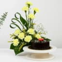 Pamper your loved ones by sending them this Delicious Truffle Cake N White Carnations Bouquet. This flowers N cake combo contains: Details: No. of Flowers: 10 Type of Flowers: Carnation decked with Gypsophila Flower Color: White Type: Bouquet Type of Cake: Chocolate Truffle Cake Shape of Cake: Round Weight: 500g.