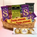 This gift basket contains: - 3 pcs of Cadbury Dairy Milk Silk (70 gms) - 1 pcs Cadbury Temptation-Rum n Raisin (72 gms) - 1 pc Cadbury Temptation-Almond (72 gms) - 2 pcs Toblerone Chocolate Bar (100 gms) - 4 pcs Ferrero Rocher - 2 pcs Cadbury Bournville (31 gms) - Cane Basket Spoil someone special with this indulgent chocolate gift basket packed with world-class treats in a charming reusable cane basket. Inside, youll find 3 bars of Cadbury Dairy Milk Silk (70g) for that silky, creamy indulgence, along with Cadbury Temptation Rum n Raisin and Almond (72g each) to satisfy gourmet chocolate cravings. Adding an international flair, the basket also includes 2 bars of Toblerone (100g each)—a Swiss classic with honey and almond nougat that never fails to impress. For a touch of elegance, there are 4 premium Ferrero Rocher chocolates with their crispy, golden hazelnut magic, and finally, 2 Cadbury Bournville bars (31g each) for those who appreciate the richness of dark chocolate. A delightful blend of classic, exotic, and luxurious chocolates, this basket is a perfect way to celebrate love, joy, or simply the art of gifting.