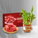 Gift elegance and sweetness with the Delightful Cherry Treat & Bamboo Blessing. This enchanting duo features 250 grams of heavenly Cherry Barfi, offering a burst of flavor that's sure to please. Alongside, the three-tier Lucky Bamboo plant stands as a symbol of prosperity and wellness, making it a thoughtful gift for any occasion. Perfectly curated to brighten someone's day, this offering is exclusively available in Ahmedabad.