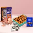 Win the hearts of your dear ones by this Delish Almond Tart Baklava N Choco Fusion and show your fondness. This Diwali Hamper contains - 1. Almond Tart Baklva (250 gm) 2. Cadbury Dairy Milk Roast Almond Chocolate Bar (36 gm) 3. Hersheys Almond Chocolate Bar (40 gm) 4. Silver Plated Ganesh Laxmi Coin 5. Crunchy Almond Potli (100g) 6. Crunchy Cashew Potli (100g) 7. Silver Plated Paan Shaped Pooja Thali 8. Free Diwali Card
