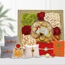This gift combo is composed of: - Set of 4 Designer Rakhi - Ganesh Laxmi Mandap - Cashews, Raisins, Almonds and Pistachios (500g Gross Wt.) - 8 pc Sapphire Hazelfill Chocolate - Free Rakhi, Roli Tika, Chawal n Card - A Designer Pearl Decorated Square Tray for Dry Fruits n Chocolates Celebrate Raksha Bandhan with this thoughtfully curated combo featuring a Set of 4 Designer Rakhi, paired with a beautiful Ganesh Laxmi Mandap to add a divine touch to the occasion. Packed in a charming Pearl Decorated Square Tray, the set also includes a delightful mix of dry fruits—cashews, raisins, almonds, and pistachios—offering 500g of wholesome goodness. Adding a sweet treat to the hamper are 8 pieces of delicious Sapphire Hazelfill chocolates. A Rakhi card along with free Roli Tika and Chawal completes this combo, making it a meaningful and joyful gift for your brothers.