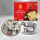 Immerse your loved ones in spiritual joy with our Devotional Blessings Gift Set. This exquisite collection features a stunning silver-plated Pooja Thali Set, along with Ashtgandh, Chandan, and an adorable small cow idol that embodies wealth and wellbeing. The gold-plated Ganesh Laxmi Mandap enhances the spiritual vibe, while the 200 gm of Bhikaram Soan Papdi adds a delightful taste to the occasion. An ideal gift for Diwali, housewarmings, or simply as a token of affection, this set beautifully combines tradition with a sweet touch, ensuring cherished memories.