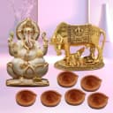 Embrace the essence of spirituality with the Divine Blessings Gift Ensemble. This lovingly curated set boasts a stunning brass Kamdhenu Cow and Calf, symbolizing abundance, alongside a gracefully crafted Marble Ganesh idol. To enhance your puja experience, six exquisite mud diyas are included, ready to bring light to your prayers. This thoughtful gift is perfect for showing love and respect during festivals or special occasions.