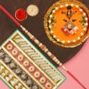 Embrace the spirit of celebration with the Divine Blessings Pooja Set. Adorned with a vibrant 8-9 inch thali, this set includes a delightful assortment of Haldiram sweets weighing 500 grams, a heartfelt Rakhi, Roli Tilak, and Chawal. It's a perfect ensemble to honor your rituals and create cherished moments with loved ones.