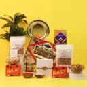Celebrate the bond of protection with our Divine Raksha Bandhan Gift Set. Featuring a stunning OM Rakhi, this box is filled with traditional sweets that will delight your senses. Enjoy the nutritious crunch of Mewa Delight almonds and pistachios alongside the sweetness of Celebrations chocolates and Cadbury Nutties. A beautifully crafted Vignesh Ganesh idol and an elegant golden plated thali complete this spiritually fulfilling package. Included are roli, chawal, a heartfelt message card, all beautifully presented in a reusable box.