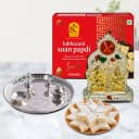 Embrace the spirit of tradition and devotion with the Divine Ritual Celebration Gift Bundle. This thoughtfully assembled collection is designed for those who cherish their spiritual practices. It features an exquisite, colorful steel puja thali set, complemented by the delectable pleasure of 100 gm Bhikaram ladoos and 100 gm of Bhikaram kaju katli. Each aspect of this gift embodies a heartfelt gesture that will make your loved ones feel valued. The stunning brass Ganesh Laxmi mandap, elegantly decorated in gold and silver, enhances the atmosphere of devotion, ensuring every pooja begins on a beautiful note.