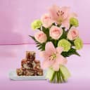 Shop Dry Fruit Burfi (250 gms) from Almond House with a 8 Flowers Bouquet (Pink Lily, White Carnations N Pink Roses) to wish your loved ones on their special days. (Only Available at Hyderabad)