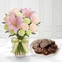 Shop Dry Fruit Dates Roll (250 g) from Shree Mithai with 8 Flowers Bouquet (Pink Lily, White Carnations N Pink Roses) to wish your loved ones on their special days. (Only Available at Chennai)