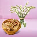 Buy Online to Send DryFruit Katli (250 gms) from G Pulla Reddy with a Rajnigandha Stems in a Glass Vase for your known N loved people. (Only Available at Hyderabad)