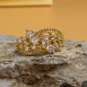 Discover the stunning Elegance Crowned Crest Ring, featuring a meticulously crafted emblem design. The luxurious gold-plated finish radiates a festive charm, while the artful arrangement of marquise and round stones evokes a sense of grandeur. The warm glow of the stones complements refined fashion, making it the perfect match for traditional and silk apparel. Its elegantly curved structure ensures all-day comfort, while the intricate micro-stone detailing enhances its beauty. Ideal for those who appreciate artisanal craftsmanship, this ring gracefully embodies the spirit of celebration and sophistication.