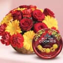 Delight someone special with the Elegant Blossom & Cookie Delight gift basket. Featuring a radiant collection of 10 beautiful red roses, 10 cheerful yellow gerberas, and 10 lush red carnations, this arrangement is a visual symphony of color and fragrance. Accompanied by a delectable box of Sapphire Butter Cookies, every bite is a dream of buttery goodness that pairs perfectly with the floral elegance. An ideal gift for celebrations or to show you care, this combo brightens any day and satisfies sweet cravings.