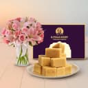 This gift combo includes: - Mixed Flowers Arrangement in Glass Vase (4 Asiatic Lilies, 6 Roses and 5 Carnations) - Mysore Pak (500g) Share a moment of elegance and indulgence with this sophisticated gift combo, featuring a mixed flower arrangement in a glass vase and 500 grams of Mysore Pak. The floral arrangement includes 4 Asiatic lilies, 6 roses, and 5 carnations, beautifully arranged to create a display that is both elegant and visually stunning. The combination of lilies, roses, and carnations offers a blend of fragrance, color, and texture that is sure to captivate. Accompanying this floral elegance is a generous portion of Mysore Pak, a rich and buttery South Indian sweet that melts in the mouth. This combo is perfect for special occasions like anniversaries, celebrations, or any time you want to convey a message of refined taste and affection.