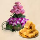 This gift combo includes: - 10 Purple Orchids N 5 Pink Roses Arrangement - Mysore Pak (500 Gms) This exquisite gift combo features a stunning arrangement of 10 elegant purple orchids paired with 5 charming pink roses, beautifully showcasing a blend of sophistication and romance. The captivating hues of purple and pink symbolize admiration and love, making this bouquet a perfect gift for special occasions or to express heartfelt sentiments. Complementing the floral beauty is 500 gms of delectable Mysore Pak, a traditional Indian sweet known for its rich, melt-in-the-mouth texture and delightful flavor. This combination of luxurious blooms and mouthwatering sweets creates a thoughtful gift that is sure to leave a lasting impression, ideal for birthdays, anniversaries, or any celebration of love and joy