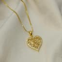 This beautifully crafted gold heart necklace showcases a detailed filigree design intricately shaped into a heart, surrounded by soft white stones that enhance its elegance. The openwork detailing brings a sense of lightness, making it ideal for everyday wear. This piece sits gracefully on the neckline, making it an excellent choice for both professional environments and casual outings. Its glossy gold finish paired with a slender gold chain adds a touch of sophistication that complements various outfits, from traditional Indian wear to modern attire. A perfect pick for women who value timeless style and subtle yet striking jewelry.