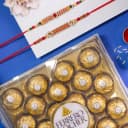Elevate your Raksha Bandhan celebrations with our Elegant Kundan Rakhi and Gourmet Chocolate Collection. This stunning ensemble features two beautifully crafted Kundan Rakhis, symbolizing your affection for your beloved brother or family member. Complementing the Rakhis is a luxurious box containing 24 Ferrero Rocher chocolates, providing a sweet delight to share during the festivities. We also include complimentary Roli, Tilak, and Chawal, along with a thoughtful message card to convey your warm wishes. This combo is a perfect representation of love and tradition, making it a memorable gift.