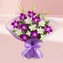 Send your heartfelt sentiments with this stunning harmony of white and purple orchids. Each blossom is a testament to elegance and charm, while the rich purple tones introduce a regal flair. Ideal for celebrations or as a thoughtful gift, this beautiful arrangement is lovingly hand-tied with soft satin ribbon and delicate netting, making it visually captivating. Whether used to commemorate a special date or simply to brighten someone's day, this bouquet will surely convey your genuine affection and appreciation.
