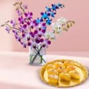 This gift combo includes: - 10 Stems of Mixed Orchids in Glass Vase - Malai Sandwich (500 Gms) This stunning gift combo showcases 10 stems of vibrant mixed orchids elegantly arranged in a sleek glass vase. The exotic beauty of these orchids, with their vivid colors and delicate petals, brings a sense of sophistication and grace to any space, making it a thoughtful gift for special occasions or to simply brighten someones day. Paired with this floral elegance is 500 gms of delicious Malai Sandwich, a soft, creamy Indian dessert made from layers of milk solids and sweetened cream. The delicate flavor of the Malai Sandwich perfectly complements the luxurious beauty of the orchids, creating a gift that balances elegance with indulgence. Ideal for celebrating cherished moments with a touch of refinement and sweetness.