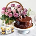 Surprise someone special with an elegant gift that conveys your deepest feelings. This beautiful basket is filled with twelve stunning pink roses that are complemented by lush green foliage. To make the occasion even sweeter, we've included a decadent Choco Truffle Cake that promises to delight every chocolate lover. Plus, a luxurious box of 16 Ferrero Rocher chocolates completes this enchanting ensemble, blending the taste of rich hazelnut and velvety chocolate. Ideal for anniversaries, birthdays, or just to say 'I care', this gift thoughtfully expresses your affection. Bring joy to their day with this exquisite arrangement!