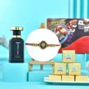 This gift hamper contains: - Single Designer Rakhi - Chhappan Bhog Assorted Mewa Bites (6 Pcs) - Park Avenue Conquer (50 ml) - Complimentary Roli Chawal - Complimentary Raksha Bandhan Card Celebrate the bond of love this Raksha Bandhan with our Elegant Rakhi with Treats N Cologne Combo designed to impress. Start with a striking single designer Rakhi that your brother will proudly wear. The set also features a pack of six assorted Chhappan Bhog Mewa Bites, perfect for sharing the festive cheer. To add a touch of sophistication, a 50 ml bottle of Park Avenue Conquer cologne is included, ensuring your brother smells his best. Essential ritual items such as Roli, Tika, and Chawal are provided to honor traditional practices. Finally, convey your love and best wishes with the complimentary Raksha Bandhan card, making this gift set a comprehensive celebration of your bond.