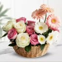 Surprise your dear ones with our Elegant Rose and Gerbera Bouquet. This exquisite display features a beautiful combination of six pristine white roses and six charming pink roses, paired with three vibrant peach gerberas and three elegant white gerberas. It's more than just a floral gift; it’s a heartfelt sentiment that conveys love and appreciation. Ideal for any event, whether it’s a birthday, anniversary, or a spontaneous act of kindness, this round basket arrangement is sure to bring a smile and some brightness into someone's life.