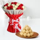 This gift combo includes: - 25 Red and White Roses Arrangemnt - Kheer Kadam (500 Gms) This exquisite gift combo features a stunning arrangement of 25 red and white roses, beautifully showcasing the elegance of these classic blooms, paired with 500 gms of delectable Kheer Kadam, creating a perfect blend of beauty and taste. The red roses symbolize love and passion, while the white roses represent purity and innocence, making this arrangement an ideal expression of heartfelt emotions for any occasion, whether its an anniversary, a wedding, or simply a gesture of appreciation. The combination of these vibrant colors brings a sense of joy and celebration to any space. Accompanying the roses is Kheer Kadam, a delightful sweet that features soft rasgulla balls enveloped in a rich layer of khoya, infused with aromatic flavors. Each bite of this indulgent treat offers a unique texture and a burst of sweetness, perfectly complementing the elegance of the roses. This thoughtful pairing creates a memorable gift that not only delights the senses but also conveys warmth and affection. Whether for a loved one or a dear friend, this beautiful combo is sure to make any moment truly special, embodying the essence of celebration and shared happiness.