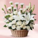 Surprise your special ones by sending this Elegant White Floral Beauty that will welcome into their hearts the breeze of love and joy. Product Details: Flowers: 18 White Carnations, 18 White Roses and 2 stem White Lilies (2*3 buds/flowers), 3 White Carnations to add height to the basket Gift Type: A Tall Basket Arrangement Gift Height: 37 Inch