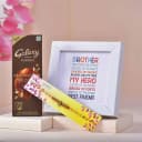 This gift set has: - Designer Ganesh Rakhi - Galaxy Fusions Chocolate Bar 50 gm - White Brother Quoted Photo Frame Send this Eternal Love Rakhi Combo to your dear brother and make him smile on Raksha Bandhan.