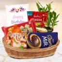 Celebrate his birthday in a remarkable way with this Exceptional Gift Basket for His Milestone Celebration. Crafted with care, this thoughtful set is designed to enhance his day with joy and warmth. Packed with a delightful assortment of Haldiram Soan Papdi and Haldiram Bhujia, it combines the best of traditional taste and crunchy goodness. Add a touch of culture with a beautifully designed Paan Thali and imbue the celebration with positivity with a Ganesh Idol. Satisfy his sweet tooth with a luscious Cadbury Dark Milk chocolate. Complete with a heartfelt Birthday Card and a Lucky Bamboo Tree symbolizing prosperity and strength, this gift basket is the perfect way to express your love on this special occasion.