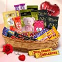 Make your dear ones very happy and delighted on Valentines Day with this Exceptional Gift Basket of Assorted Chocolates with V-Day Essentials containing your love for them. This Valentine Special Gift Basket include: 1) 2 pc Cadbury 5 Star Chocolates, 2) 2 pc Twix, 3) 2 pc Snickers, 4) 2 pc Mars, 5) 2 pc Toblerone, 6) 2 pc Temptation, 7) 8 pc Ferrero Rocher Chocolates, 8) 2 pc Nestle Munch, 9) 2 pc Nestle Kitkat, 10) 2 pc Cadbury Perk, 11) 2 pc Cadbury Bournville, 12) Red Velvet Rose, 13) 6in Teddy, 14) Heart Shape Key Ring, 15) I Love You Card and 16) I Love You Mylar Balloon (1 pc).