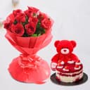 Bring joyful moments into the lives of your dearest ones with Delightful 10 Red Roses Bouquet with ½ kg Red Velvet Cake N Teddy and let them cherish it for lifetime.