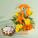 Imagine a joyful gathering heightened by the sweetness of Bikanervalas Kaju Katli, complemented by a stunning bouquet that enchants the atmosphere. This exceptional set includes 500 grams of premium Kaju Katli, a symbol of taste and tradition, alongside a beautiful floral arrangement crafted to brighten any occasion. Perfect for sharing or treating yourself, this combination is sure to bring delight to your loved ones. Available exclusively in Ahmedabad, make this charming gift a part of your celebrations!
