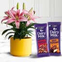 Tether your loved ones to your heart by sending this Fancy Xmas Gift of Live Lily Plant in Yellow Plastic Pot (3 X 3 Inches) with Cadbury Milk Chocolates and surprise them with your special gesture. This Cadbury Milk Chocolates Pack contains Cadbury Dairy Milk Roast Almond Chocolate Bar (36g) n Cadbury Dairy Milk Chocolate Bar - Fruit and Nut (38 g).